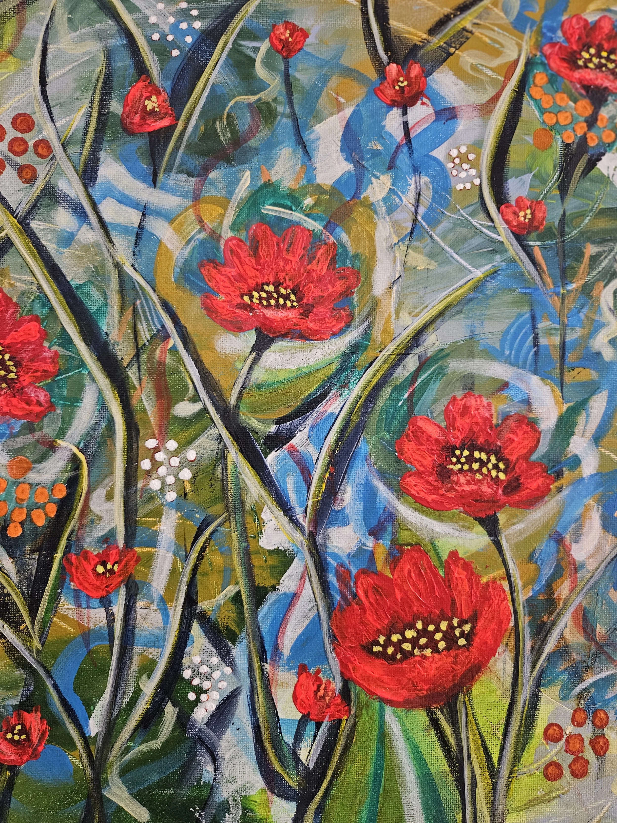 This original, acrylic painting is bursting with joy and movement. It is a joyful expression of wild blooms swaying in the breeze.